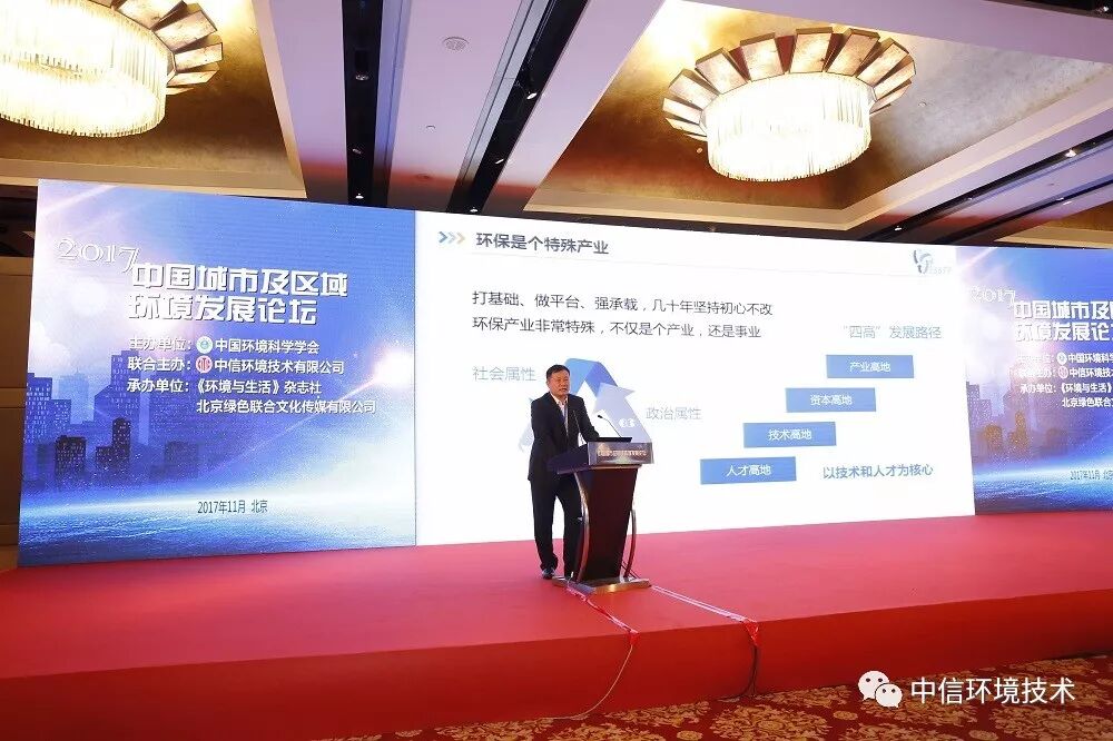 11月4日,由中国环境科学学会与中信环境技术联合主办的“2017年中国城市及区域环境发展论坛”在北京隆重举行。此次论坛紧扣全社会关注的“改进环境质量,助力转型升级”的主题,是十九大习近平总书记对生态环境建设提出新思想、新要求、新目标、新部署后,为地方政府提供了一次难得的绿色环保发展顶层设计理念及商业模式的经验分享和决策建议的交流平台。在论坛上,大家共同探讨符合地方发展的环境治理商业模式,交流适宜地方环境区域特征的低成本高效率的环境治理技术,并提供因地制宜的地方环境整体解决方案。来自环保部、国资委、中科协等机构的领导和包括中国工程院院士在内的国内水环境治理领域专家、各县市级地方政府、相关环保部门等各领域代表逾200人参加了论坛。